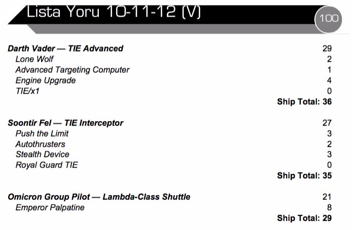 – No se permiten fotocopias o cartas no originales para representar pilotos, mejoras o cualquier elemento del juego. Se deben tener tantas cartas de mejora como estén incluidas en la lista (así, por ejemplo, si se quieren meter 3 “Tácticas de enjambre”, se deberá disponer de 3 cartas de este tipo).
